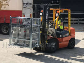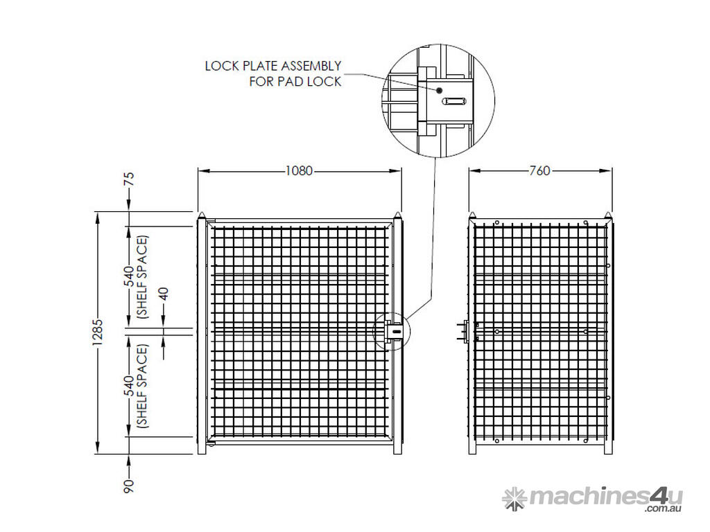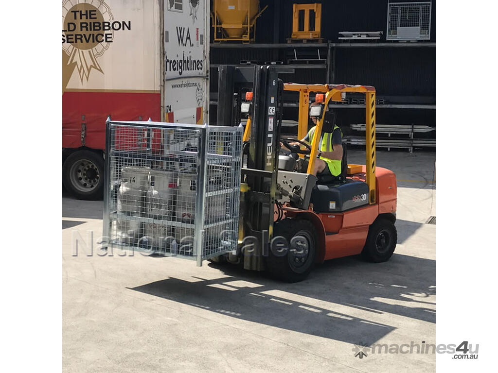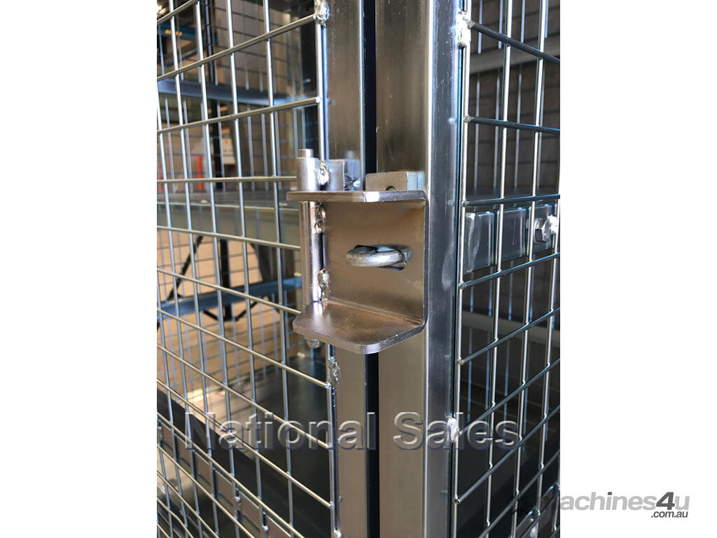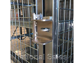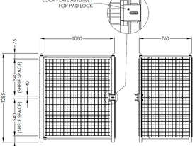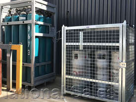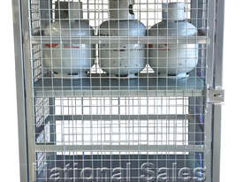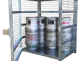 The type NS-GC9-H Gas Bottle Storage Cage has been designed primarily as a secure storage unit for building sites and mines. The lockable gate, mesh sides and galvanised roof sheeting ensure Bottle and gear security. Forklift provision under the cage along with stacking lugs underneath for transport. Supplied flat packed. The standard finish on the Cage is Zinc Plated.